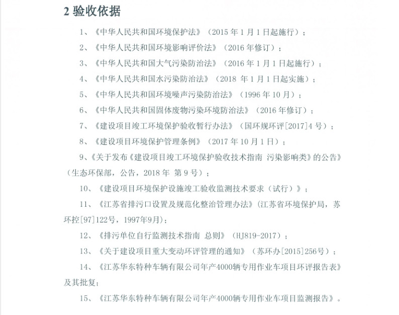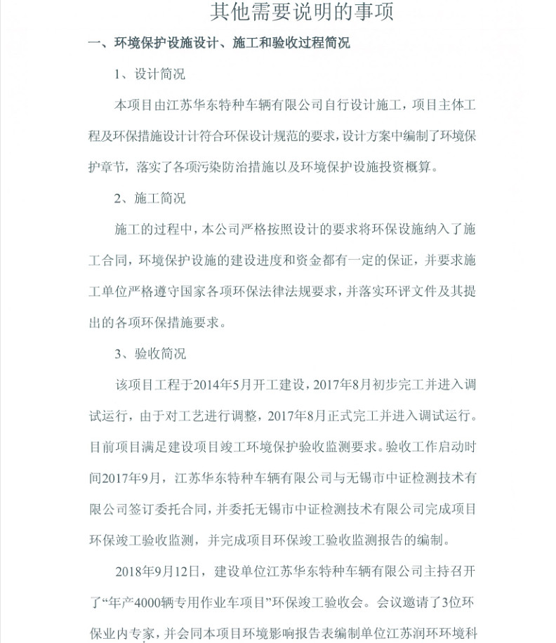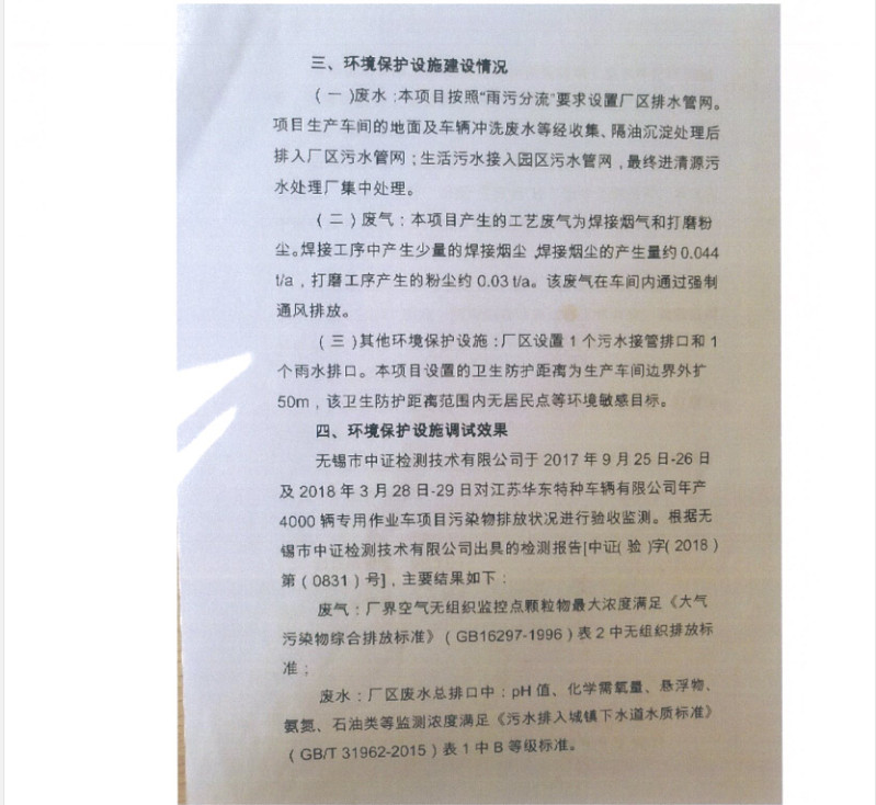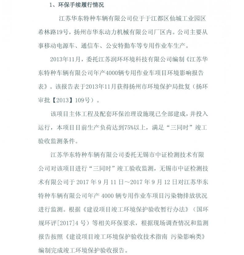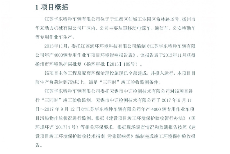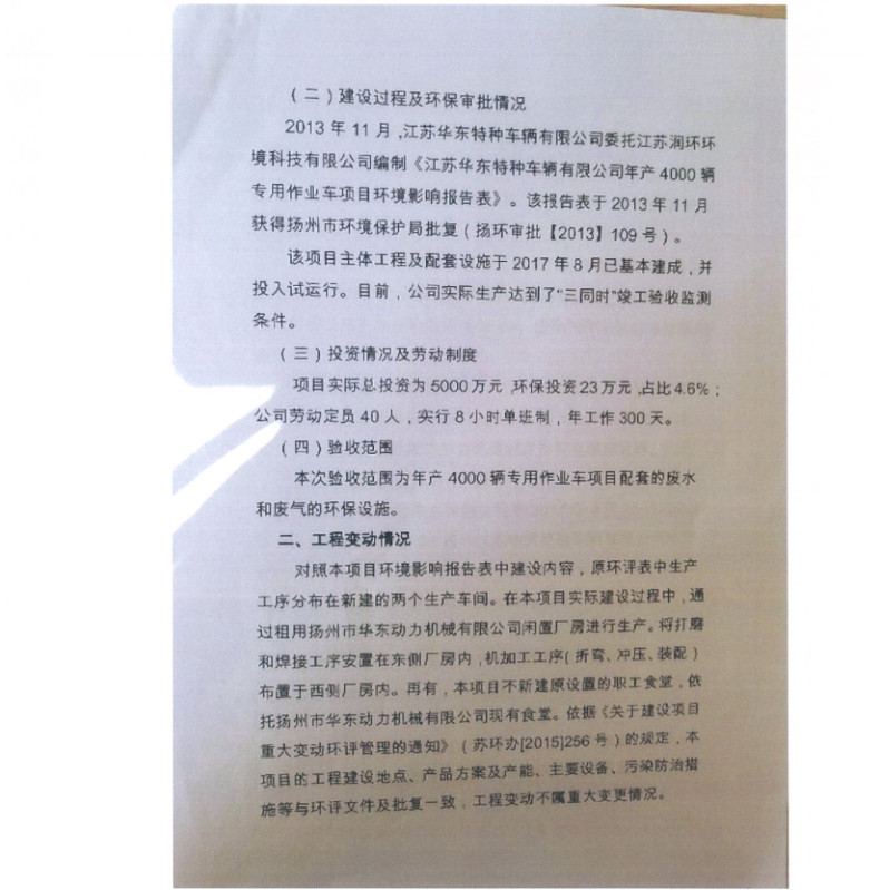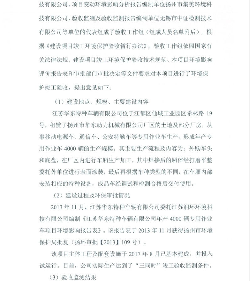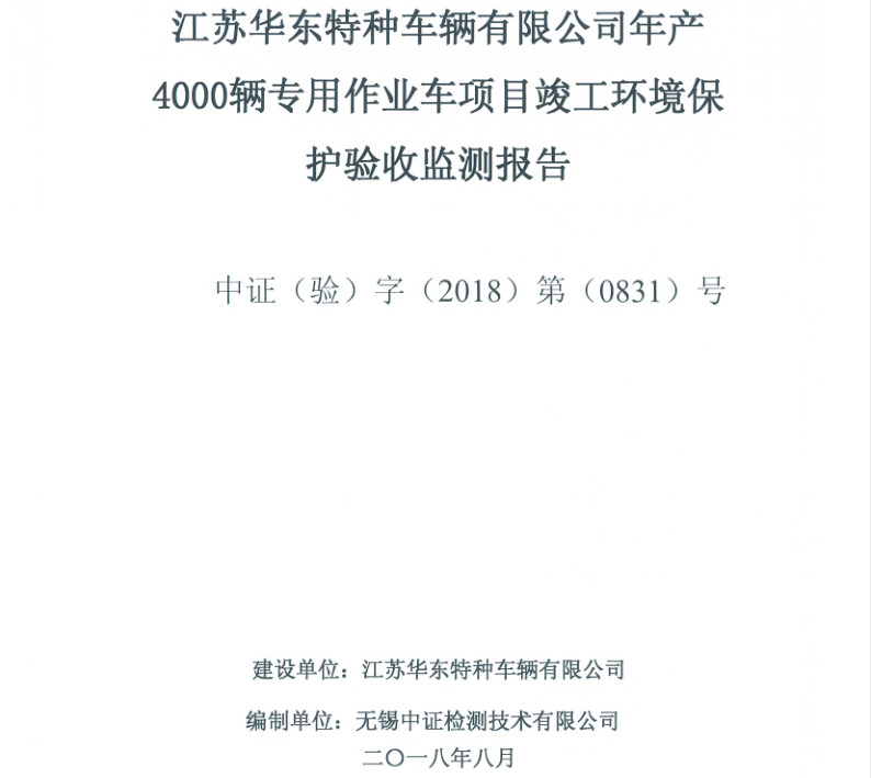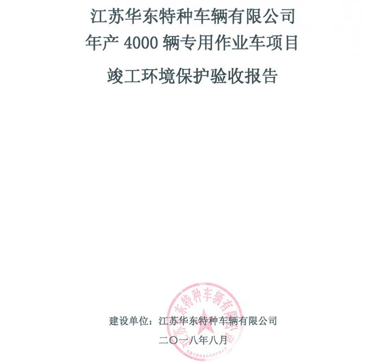 江蘇華東特種車輛有限公司年產(chǎn)4000輛專用作業(yè)車項目竣工環(huán)境保護驗收報告